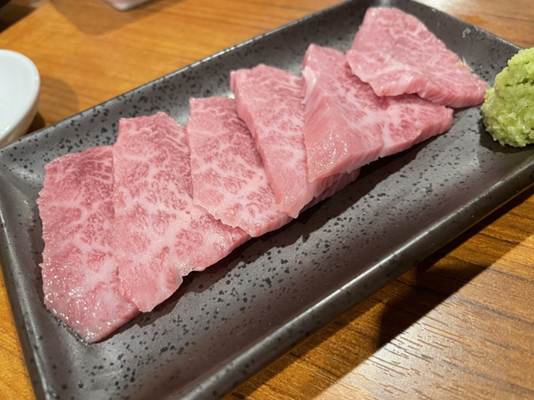 This is one of the most popular cuts for yakiniku due to its rich flavor, a mix of sweetness and umami, and its moderate amount of marbling. While it has a coarse texture, it is still tender when cooked and it pairs well with the dipping sauces you’ll find at your table!