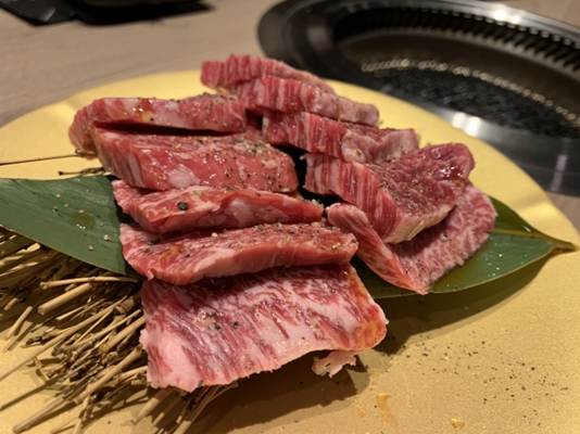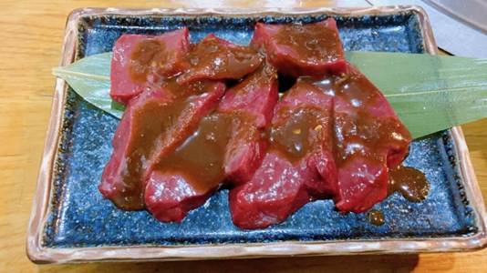 This cut of beef usually looks like a leaf, and it has beautiful marbling. Most Japanese prefer to cook this cut until it is lightly pinkish-brown on either side (rare or medium-rare doneness), after which they can enjoy the meat’s flavorful taste. Misuji melts in your mouth and is rich in umami! It’s definitely a perfect start to your yakiniku food tour!